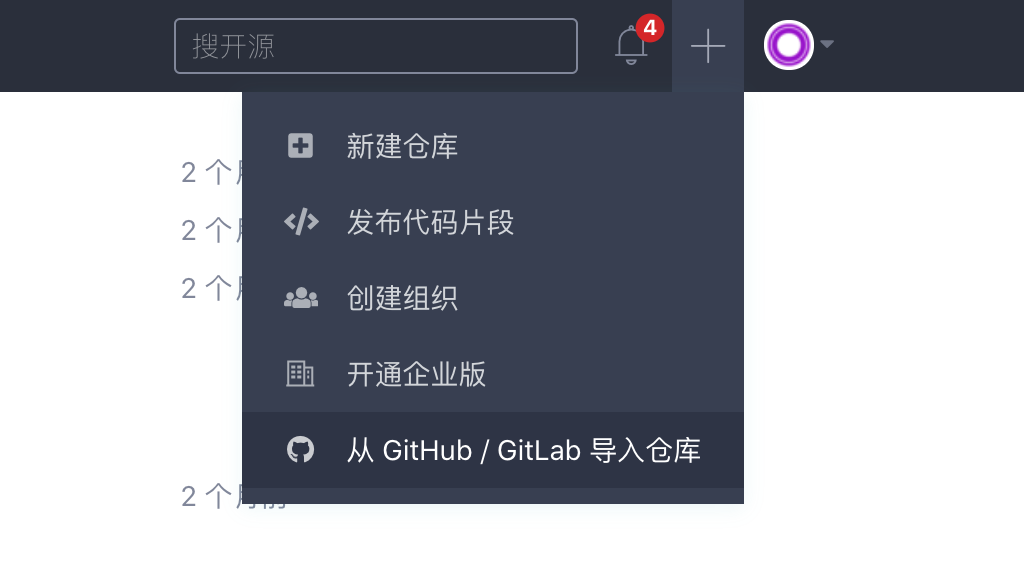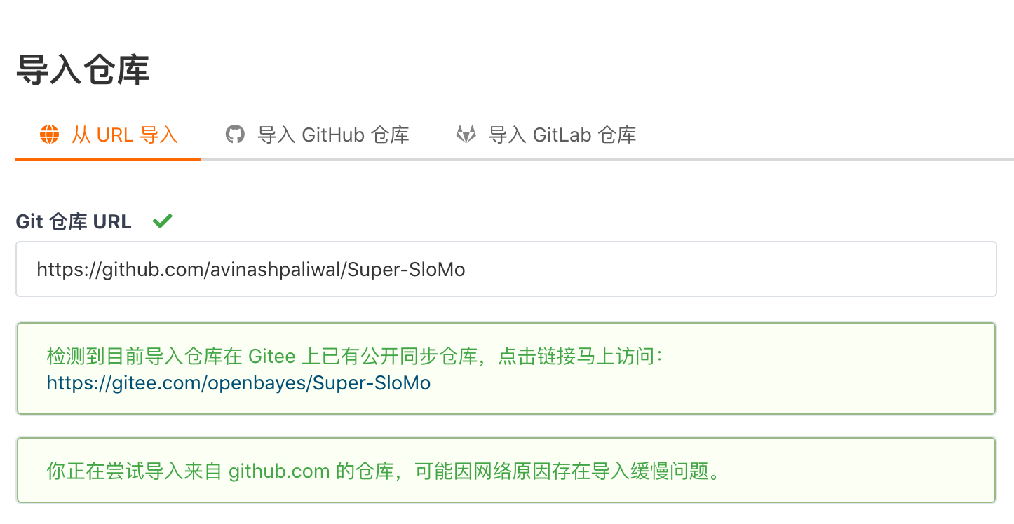然后,找到对应的项目链接 https://github.com/avinashpaliwal/Super-SloMo 将其复制到剪切板。切换到 Gitee,在右上角点击「+」号,选择「从 GitHub / GitLab 导入仓库」: